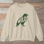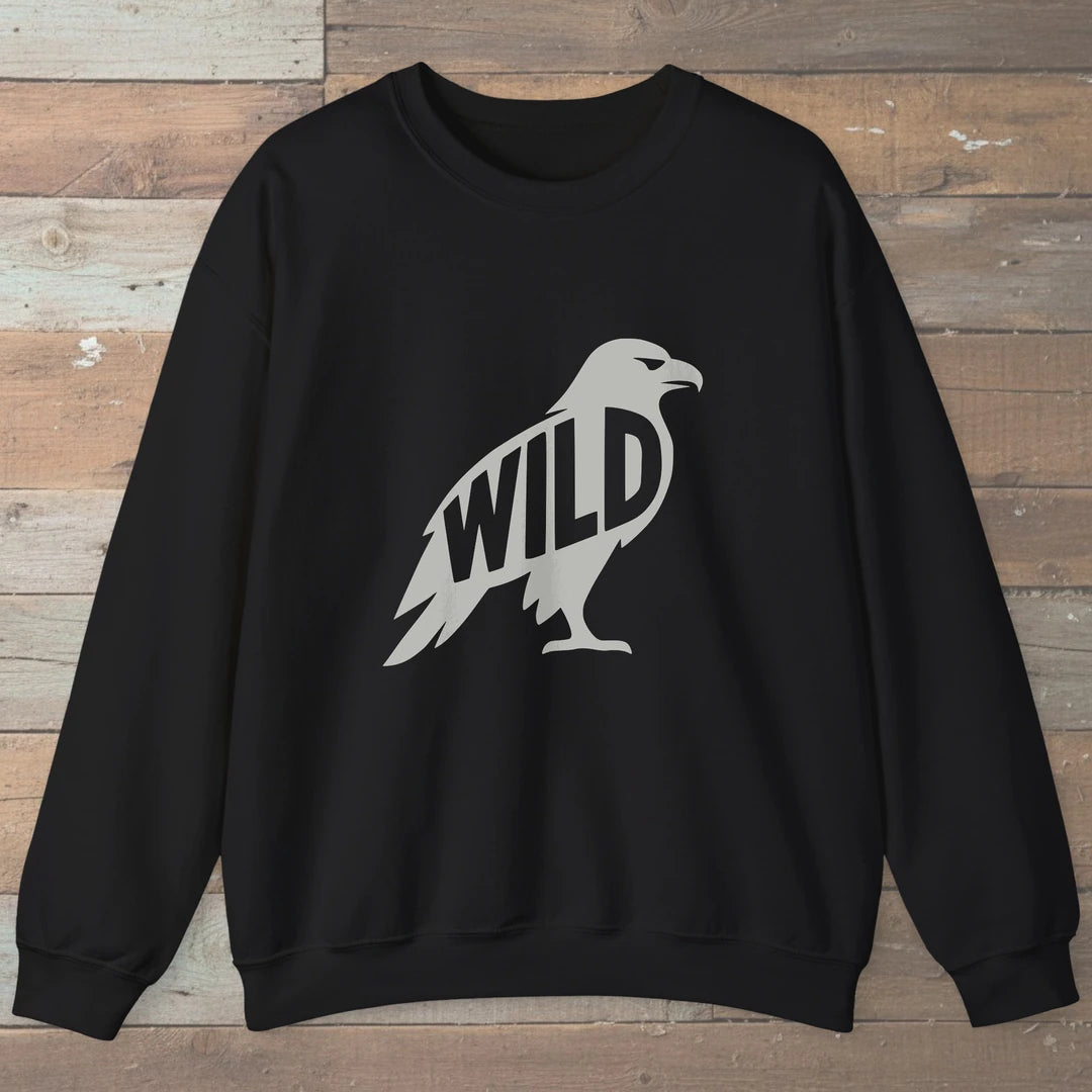 This sweater carries the call of the wild. A raven silhouette with the word wild reflects freedom, strength, and the spirit of open skies.