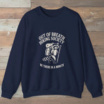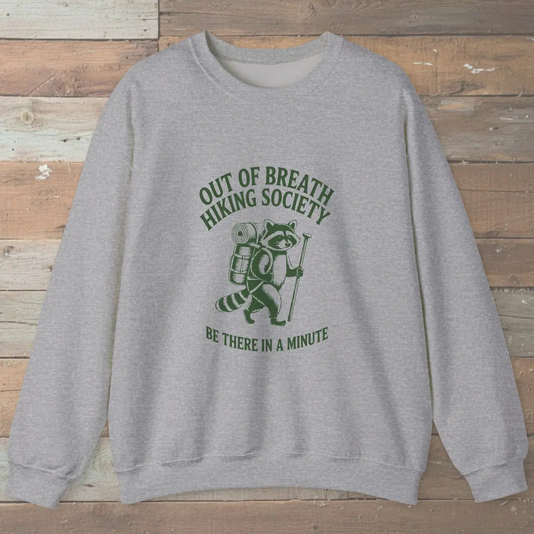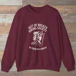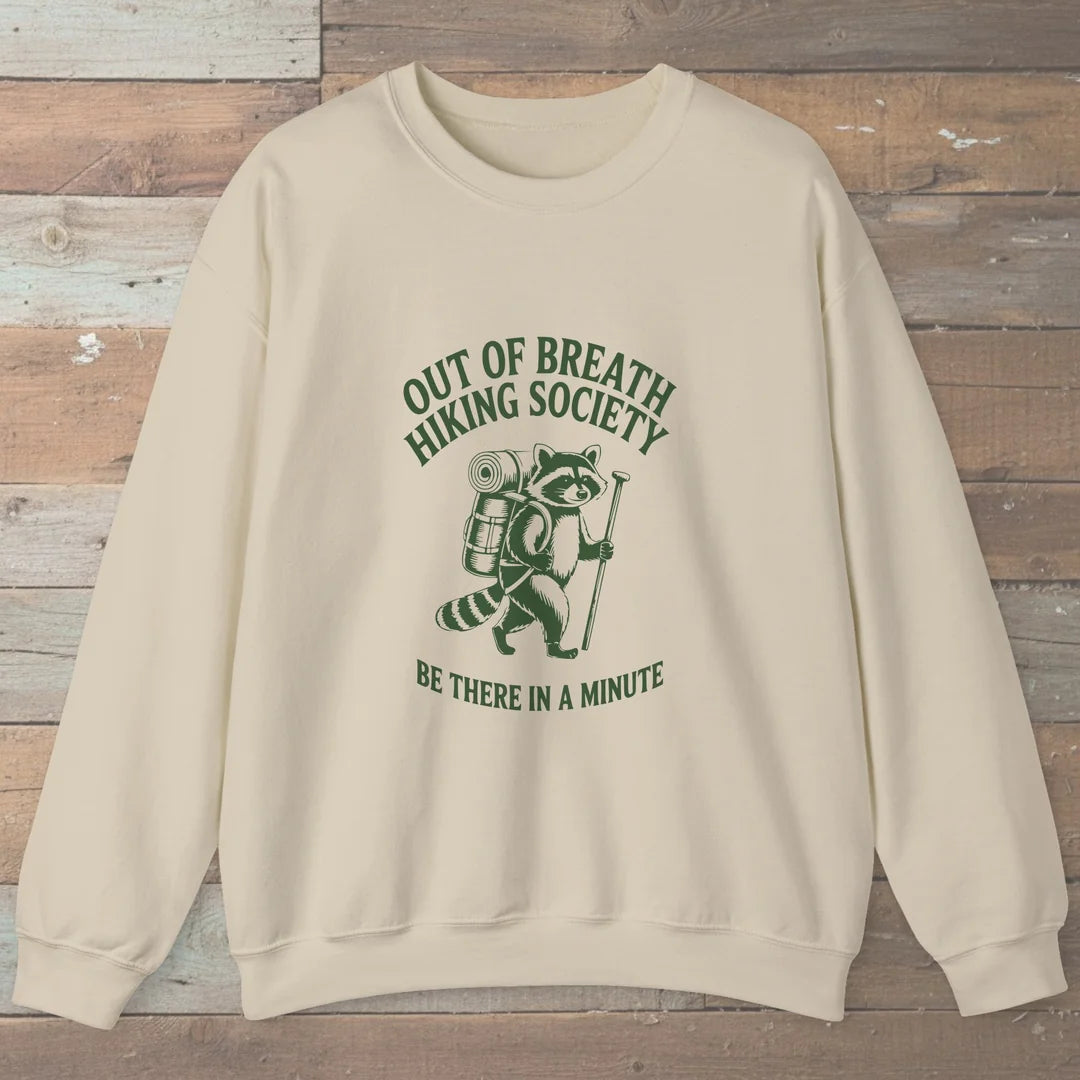 For hikers who laugh, pause, and keep going. This sweater nods to the Out Of Breath Hiking Society and the promise to be there in a minute, no matter the climb.