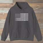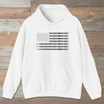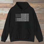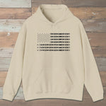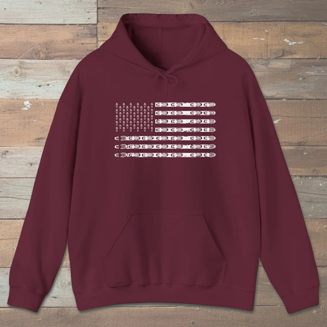 For early trailheads and late returns, this hoodie carries a flag built from boot tracks. It speaks to hikers who measure time in miles and remember every climb.